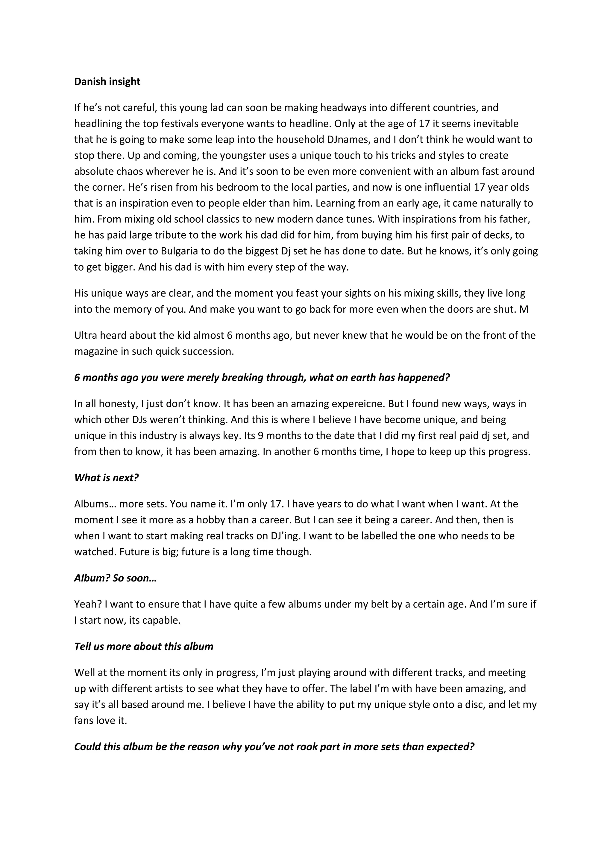 This document discusses an up-and-coming 17-year-old DJ who has risen from playing local parties to becoming influential in the industry in just 9 months. He is working on his debut album which he hopes will set the foundation for his future progressions. The album is being created with unique styles and collaborations with other well-known artists. While focusing on finishing the album, he is also looking forward to playing his first UK festival this summer as well as sets abroad in Bulgaria, Croatia and Russia.