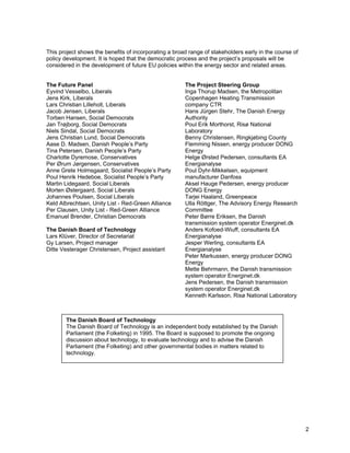 This document summarizes a project conducted by the Danish Board of Technology examining possible paths for the future development of the Danish energy system. The project incorporated input from stakeholders across Danish political parties and energy sectors. Scenarios were developed to halve CO2 emissions and reduce oil consumption by 50% by 2025 through energy savings, increased wind and biomass, and electric vehicles. A combination scenario showing these targets can be achieved will undergo further stakeholder consultation to specify actions and measures for realization. The project aims to inform the European Commission's strategy for sustainable, competitive and secure energy.