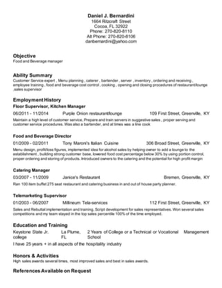 This document is a resume for Daniel J. Bernardini. It lists his objective as seeking a food and beverage manager position. His experience includes over 25 years working in various roles in the hospitality industry, including as a floor supervisor and kitchen manager at a restaurant/lounge from 2011-2014, food and beverage director at an Italian restaurant from 2009-2011 where he helped add a lounge, and catering manager at another restaurant from 2007-2009 where he managed a 275 seat buffet and catering business. He also has experience in telemarketing sales and management.