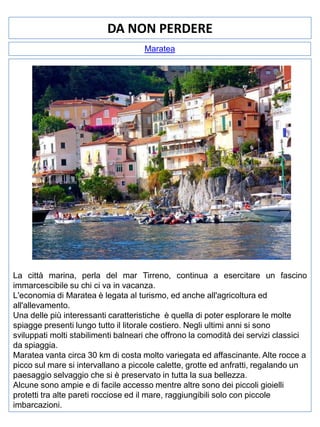 Il documento evidenzia diverse attrazioni e attività da non perdere in Italia, incluse esperienze culturali, storiche e naturalistiche. Luoghi come il castello di Semivicoli, Maratea, e il Parco Nazionale del Pollino sono raccomandati per la loro bellezza e unicità. Inoltre, vengono citati autori e storie che arricchiscono la cultura gastronomica e letteraria del Paese.