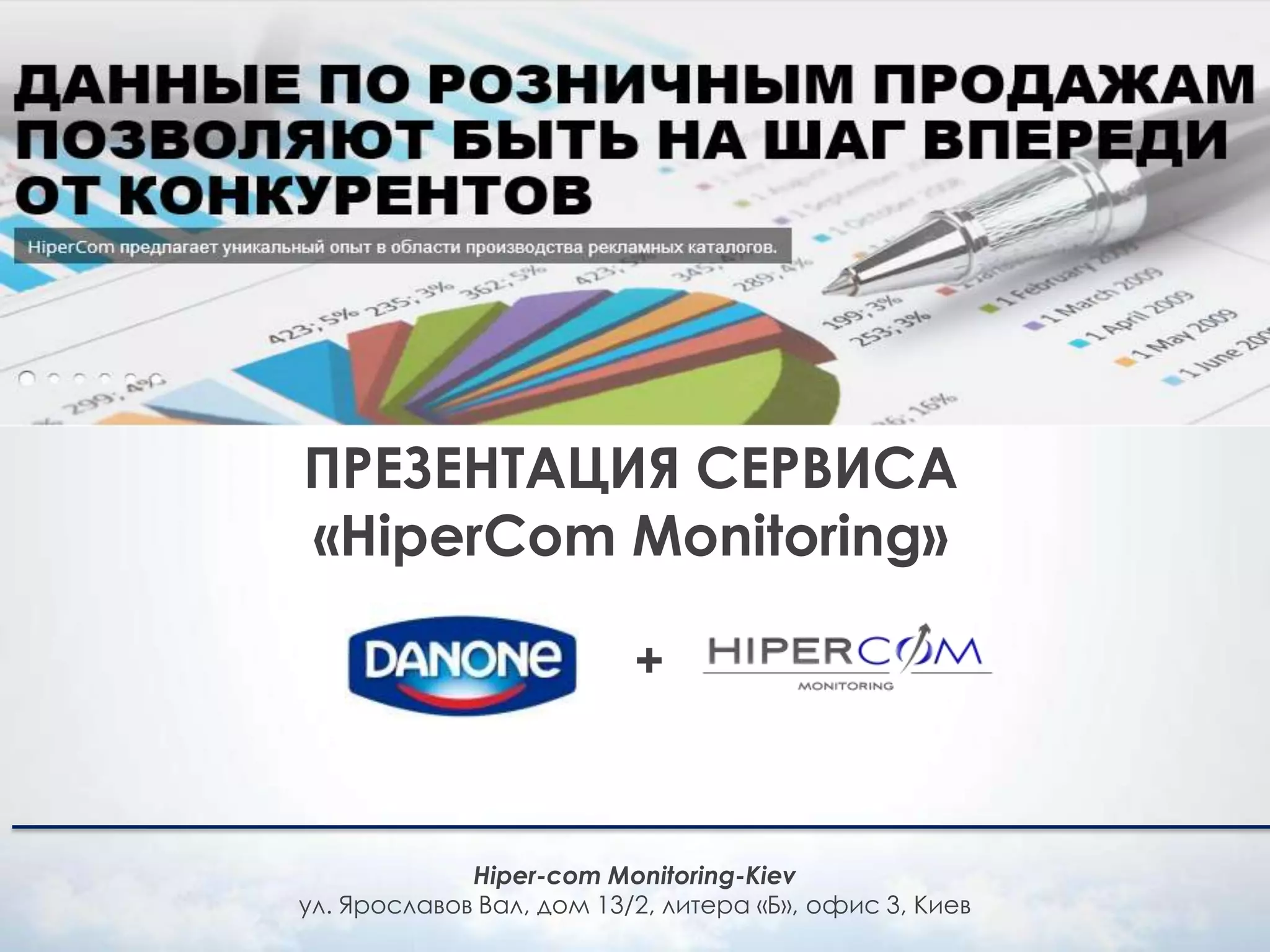 Документ представляет собой презентацию сервиса «hipercom monitoring», посвященного анализу промо операций на рынке кисломолочных продуктов. Он содержит сравнительный анализ долей промо для основных брендов, таких как Danone и Лакталис, а также обзор эффективности промо механик и стратегий торговых сетей. Последующий анализ позволяет понять, какие рынки и конкурентные стратегии оказывают наибольшее влияние на продажи в данном сегменте.