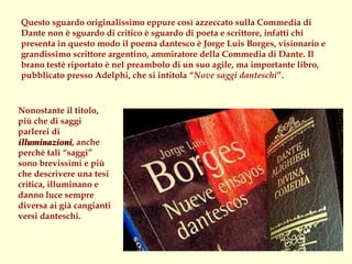 Il documento analizza i 'Nove saggi danteschi' di Jorge Luis Borges, evidenziando come questi scritti illuminino vari aspetti della 'Divina Commedia' attraverso un'originale interpretazione poetica e letteraria. Borges esplora la complessità dell'opera di Dante, sottolineando la sua capacità di evocare profondi sentimenti e significati attraverso dettagli e simboli, e invita alla riflessione sulla verità e sull'allegoria nell'aldilà rappresentato da Dante. Inoltre, il testo discute il rapporto tra il personaggio di Dante e le sue emozioni, così come l'interazione con figure storiche e letterarie, creando un dialogo ricco di spunti di riflessione.