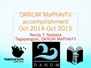 This document provides a summary of the activities and accomplishments of DANUM MaPhArFil from October 2014 to October 2015 under the leadership of Randy T. Nobleza. It describes conferences, workshops, and cultural events attended to promote peripheral research and studies from non-central areas of the Philippines. These include presentations at national and international conferences, collaboration with local studies centers, and arts and culture activities to discuss concepts like autonomous spaces, free and open source practices, and creative resistance.