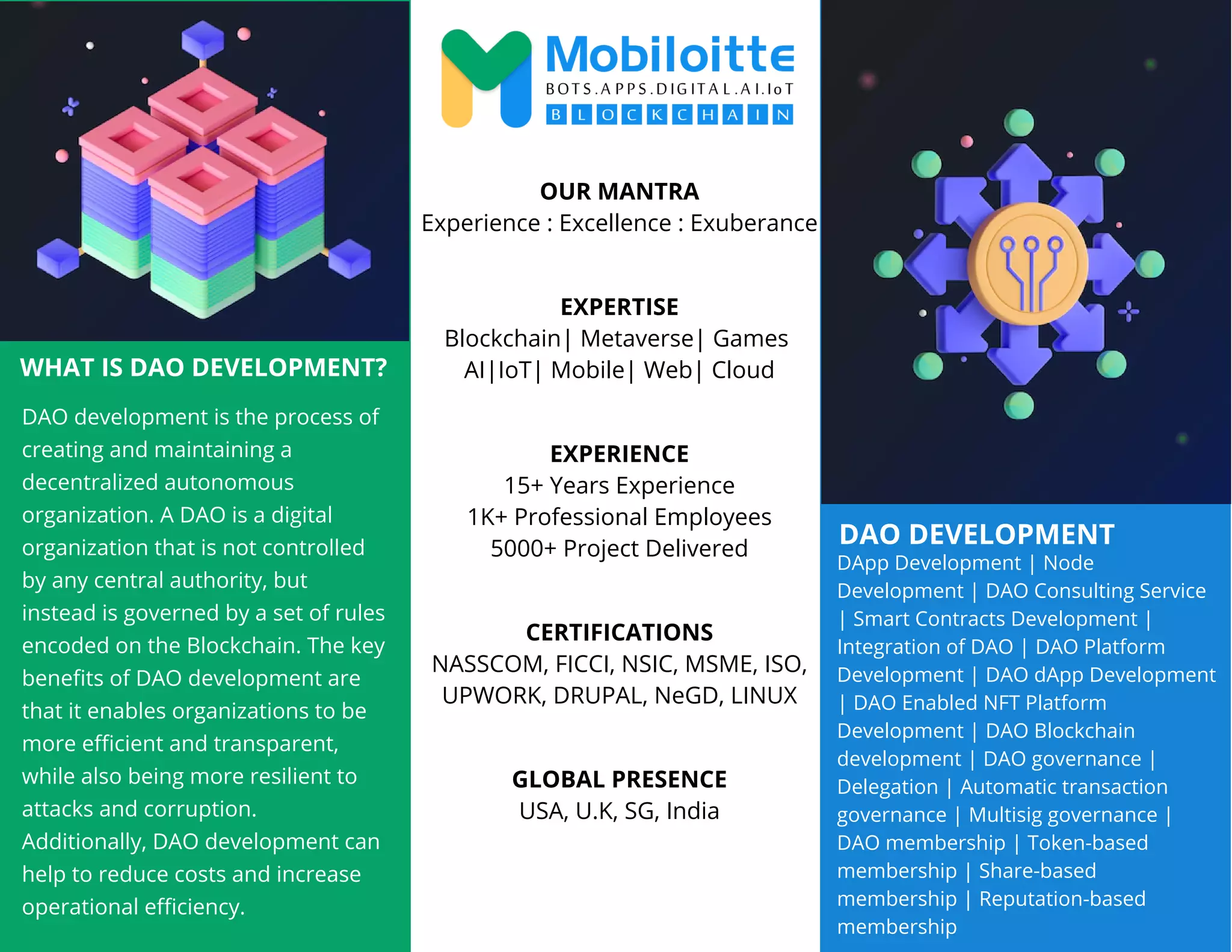 DAO development involves creating and maintaining decentralized autonomous organizations governed by blockchain-encoded rules, promoting efficiency, transparency, and resilience. Key services offered include DApp development, DAO consulting, smart contract development, and governance models tailored to client needs. Mobiloitte, with over 15 years of experience and a skilled team, provides comprehensive DAO solutions and support for various governance models.
