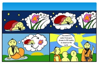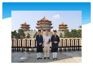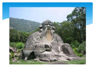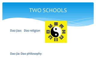 Taoism originated in ancient Chinese spirit worship and philosophy. It has two schools - Taojiao which is the religious branch focused on gods/goddesses and pursuing immortality. Taojia is the philosophical branch founded by Laozi who authored the Tao Te Ching, which describes Tao as the natural order of the universe and advocates wu wei or non-action. Unlike Confucianism which emphasizes social order, Taoism focuses on living in harmony with Tao through nature and by taking no action against the natural flow of events.