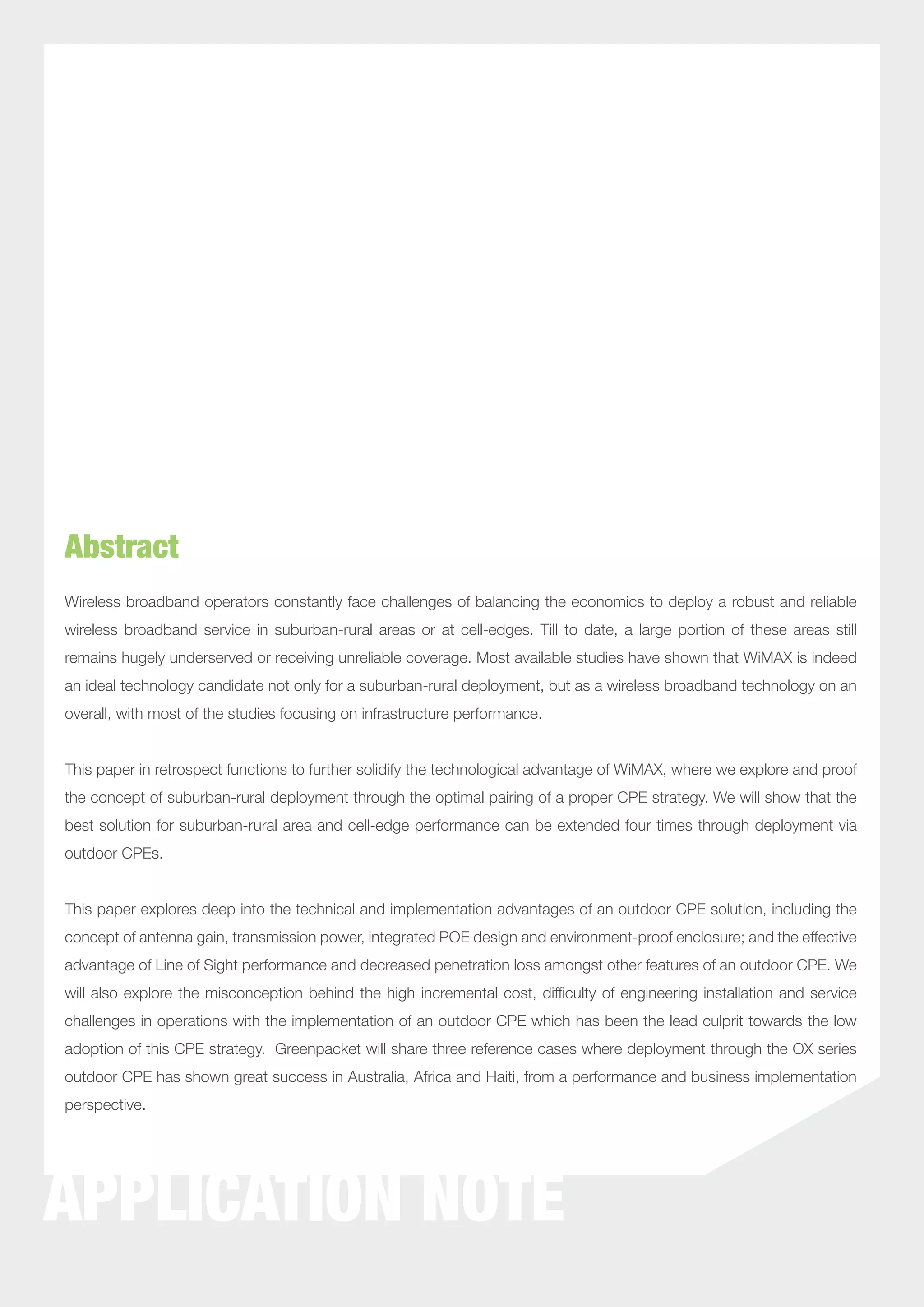 The document discusses the challenges wireless broadband operators face in deploying reliable service in suburban-rural areas and cell-edge locations, highlighting that WiMAX technology is a viable solution. It emphasizes the advantages of using outdoor Customer Premises Equipment (CPE), including improved signal strength, zero penetration loss, and ease of installation, while dispelling common misconceptions about outdoor CPE costs and performance. The document also presents successful deployment cases from regions like Australia, Africa, and Haiti, showcasing the effectiveness of outdoor CPE solutions in enhancing broadband accessibility.