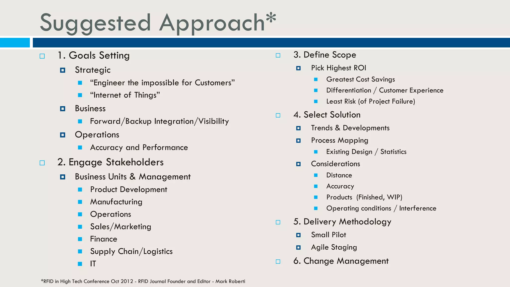 The document outlines a strategic approach to supply chain visualization services, emphasizing goal setting, stakeholder engagement, and defined scopes to enhance operational efficiency. It discusses the selection of appropriate solutions based on ROI and operational benchmarks while noting the importance of change management and potential risks. Additionally, it highlights the integration of RFID technology for tracking, monitoring, and streamlining processes in various industries.