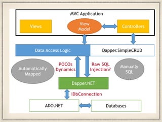 This document provides information about Dapper and Dapper.SimpleCRUD, two libraries that simplify data access with .NET and SQL Server. It discusses installing the libraries via NuGet, and how they enable executing queries, inserts, updates, deletes and stored procedures with minimal code. Dapper.SimpleCRUD adds additional functionality like model attributes and one-to-many mapping to simplify working with related data. Links are also provided to tutorials and Stack Overflow questions about more advanced Dapper features.