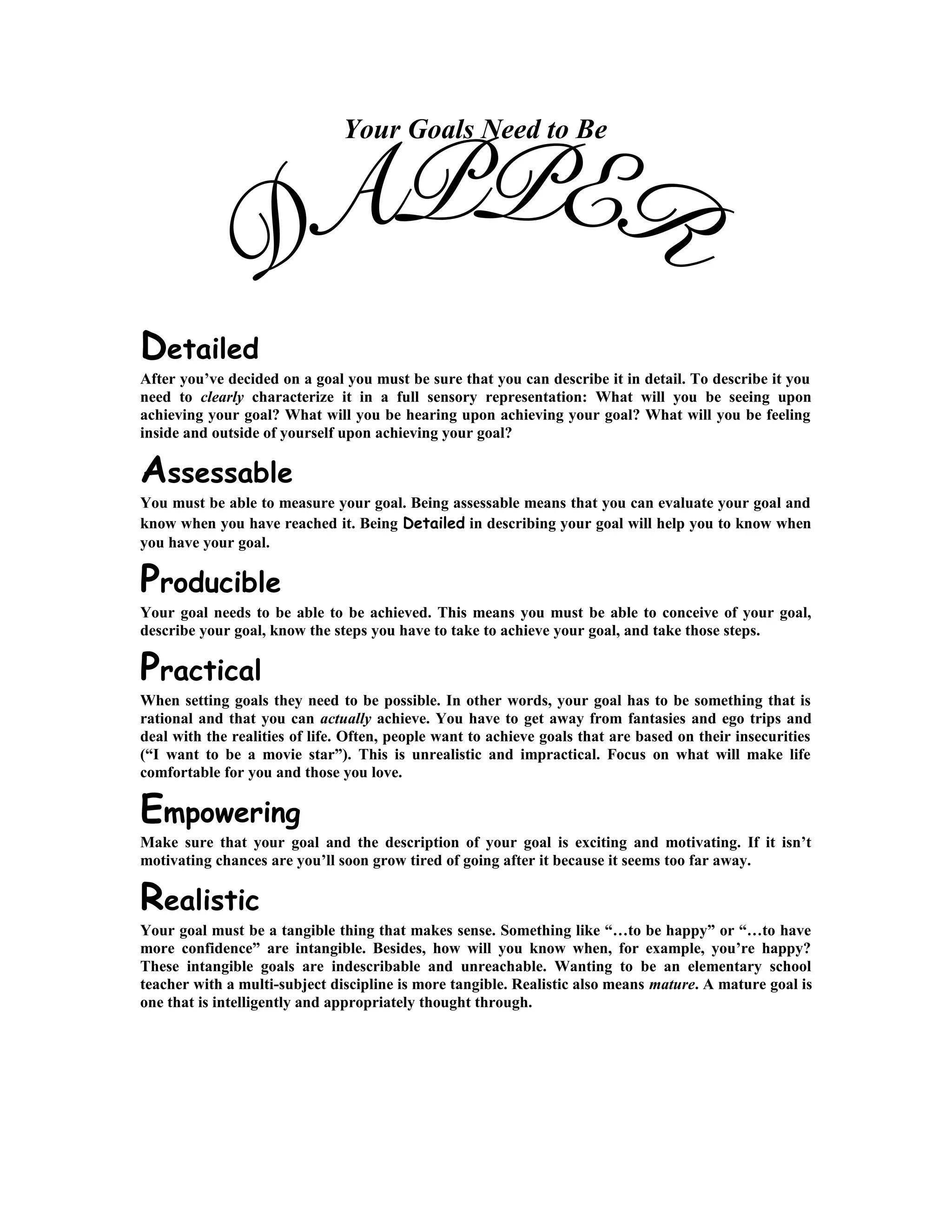 1. Goals need to be detailed so they can be fully described using sight, sound, and feelings upon achieving the goal.