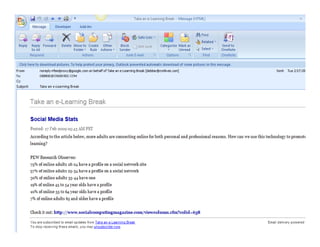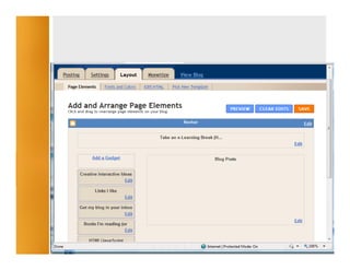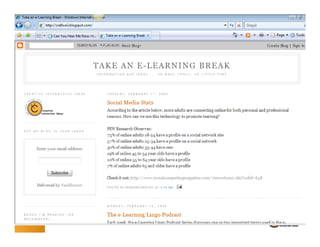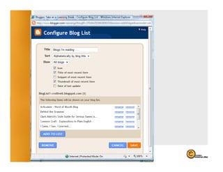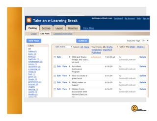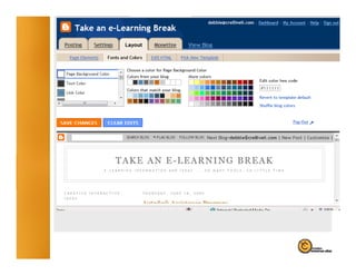 This document discusses using blogs for quick e-learning and provides information on blogs including their basic features and benefits for learning. It outlines how blogs allow easy sharing of resources, are quick to update, and allow commenting. The document then covers creating blogs through free and paid hosting services and provides tips for blog content, structure, and tools.