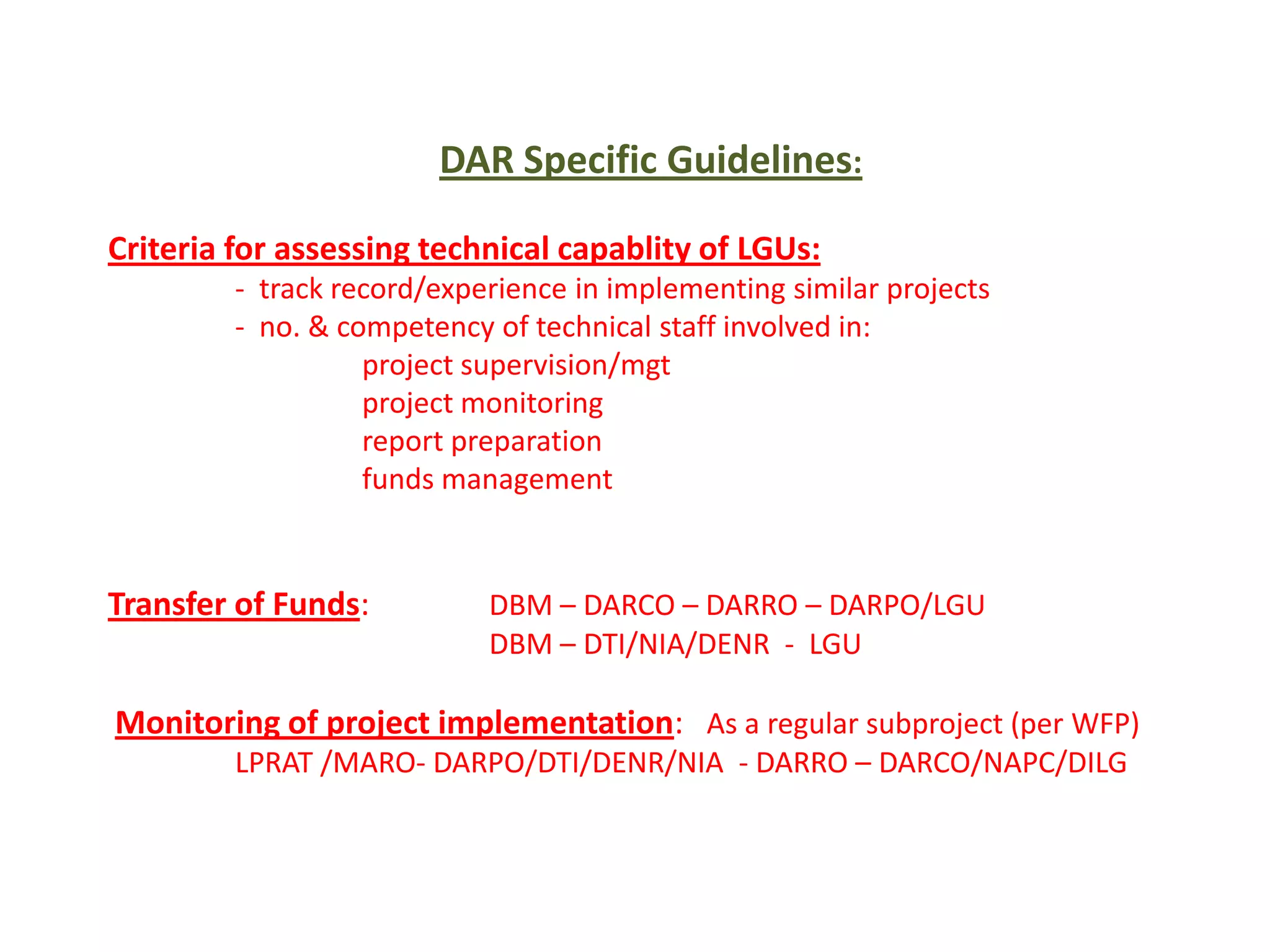 The document outlines guidelines for assessing local government units' (LGUs) technical capability to implement projects and manage funds. It discusses the process for transferring funds from the Department of Budget and Management to LGUs via participating agencies. It also describes how project implementation by eligible LGUs will be monitored regularly, and the documents required from LGUs to receive funds. Projects proposed by LGUs will be validated based on location, number of farmers benefitted, inclusion in area development plans, physical targets, cost breakdowns, and implementation plans.