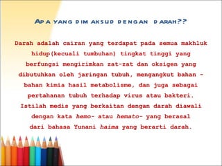 Apa yang dimaksuddengan darah?? Darah adalah cairan yang terdapat pada semua makhluk hidup(kecuali tumbuhan) tingkat tinggi yang berfungsi mengirimkan zat-zat dan oksigen yang dibutuhkan oleh jaringan tubuh, mengangkut bahan - bahan kimia hasil metabolisme, dan juga sebagai pertahanan tubuh terhadap virus atau bakteri. Istilah medis yang berkaitan dengan darah diawali dengan kata hemo- atau hemato- yang berasal dari bahasa Yunani haima yang berarti darah.