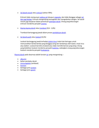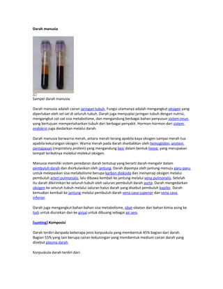 Darah manusia adalah cairan jaringan tubuh yang berfungsi mengangkut oksigen, nutrisi, dan zat sisa metabolisme, serta terlibat dalam pertahanan imun dan transportasi hormon. Terdiri dari 45% korpuskula (sel darah merah, trombosit, dan sel darah putih) dan 55% plasma, darah memiliki peredaran tertutup yang dipompa oleh jantung melalui pembuluh darah. Komposisi dan fungsi darah sangat penting untuk kesehatan dan keseimbangan tubuh.