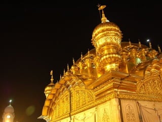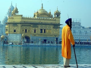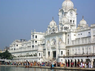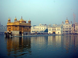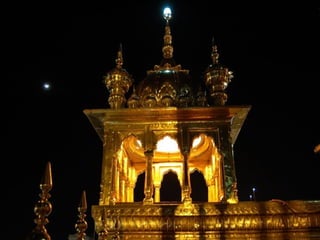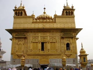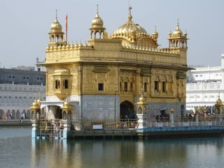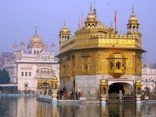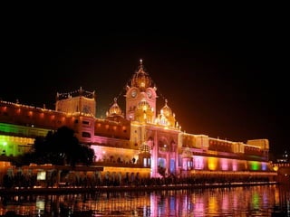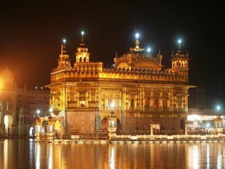 The Golden Temple in Amritsar, India is the most significant place of worship for Sikhs. It houses the eternal Guru Granth Sahib Ji and is considered holy. The golden plates covering the exterior were added under Maharaja Ranjit Singh and make it culturally significant. It is moved daily between the main temple and a hall at 10 PM and back in the morning.