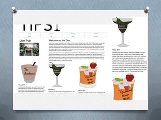 This document provides recommendations for bars for those aged 21 and up in different neighborhoods of San Francisco, including Geary, Polk Street, Mission, Marina, Lower Haight, and others. It summarizes 5 relatively low-key bars in these areas and provides details on their drink options and environments. The document also highlights specific bars like Lion Pub, Zeitgeist, Molotov's, Rye Bar, and Jones, with notes on their drink selections and prices.