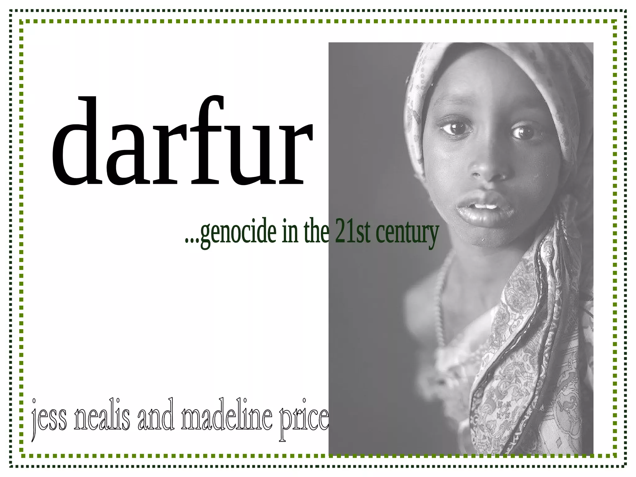 Over the past 15 years in Darfur, Sudan, over 400,000 civilians have been killed and 2.5 million people displaced due to genocide against non-Arab populations. The Sudanese government has supported Arab militias in killing and carrying out acts of violence and sexual slavery against civilians. Despite resources like oil, Sudan has high poverty and a repressive government. The conflict began in 2003 when rebel groups rose up against government neglect of the region and arming of militias. Various attempts have been made at peace agreements and intervention, but violence continues.