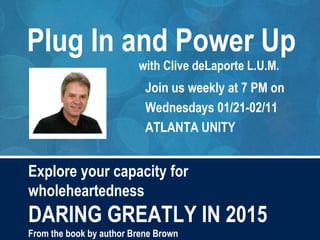 The document promotes a series of weekly meetings focused on Brené Brown's concepts of 'daring greatly' and wholehearted living, encouraging participants to engage in discussions and explore themes such as vulnerability, authenticity, and self-compassion. It outlines ten guideposts for cultivating a fulfilling life, emphasizing the importance of letting go of limiting beliefs and fear. The event aims to inspire individuals to embrace their divine potential and live authentically in 2015.