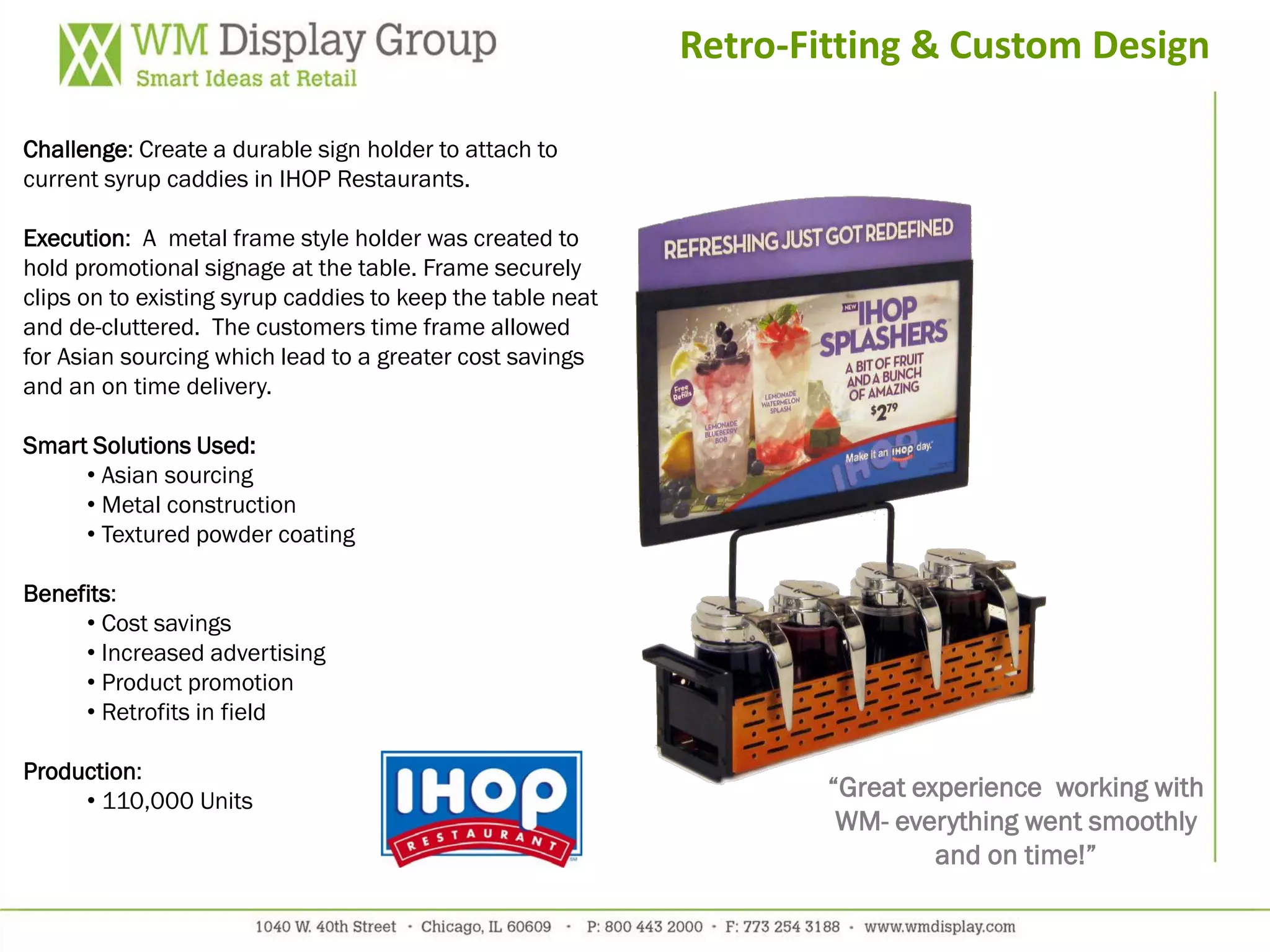 The document outlines several custom design projects for retail displays, including a durable sign holder for IHOP syrup caddies and custom video displays that enhance advertising and sales. Key benefits include cost savings, increased brand awareness, and effective marketing strategies tailored to target demographics. The production runs for these projects vary, showcasing a commitment to efficient and timely delivery.