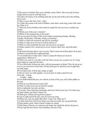 The document contains riddles and puzzles with ambiguous or abstract answers. It does not provide a clear narrative or essential information that can be succinctly summarized in 3 sentences or less.