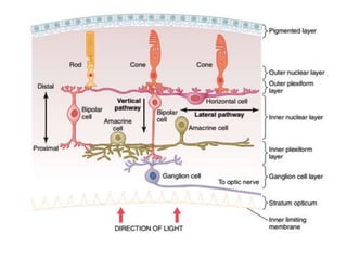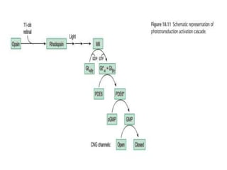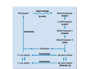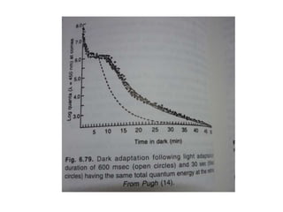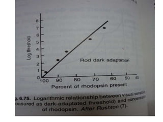 This document discusses dark adaptation, which is the ability of the eye to adapt to decreasing levels of illumination. It describes the mechanisms and factors that affect dark adaptation. The mechanisms involve restoration of visual pigments in rods and cones as well as neural and pupillary adaptations. Factors that influence dark adaptation include characteristics of the pre-adapting light, test stimulus used, and individual differences such as vitamin A levels, ocular diseases, and genetic disorders that impact night vision. Several genetic disorders that impact dark adaptation are also discussed such as congenital stationary night blindness and Stargardt's disease.