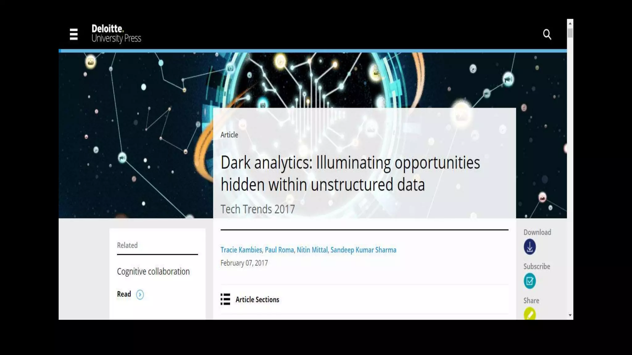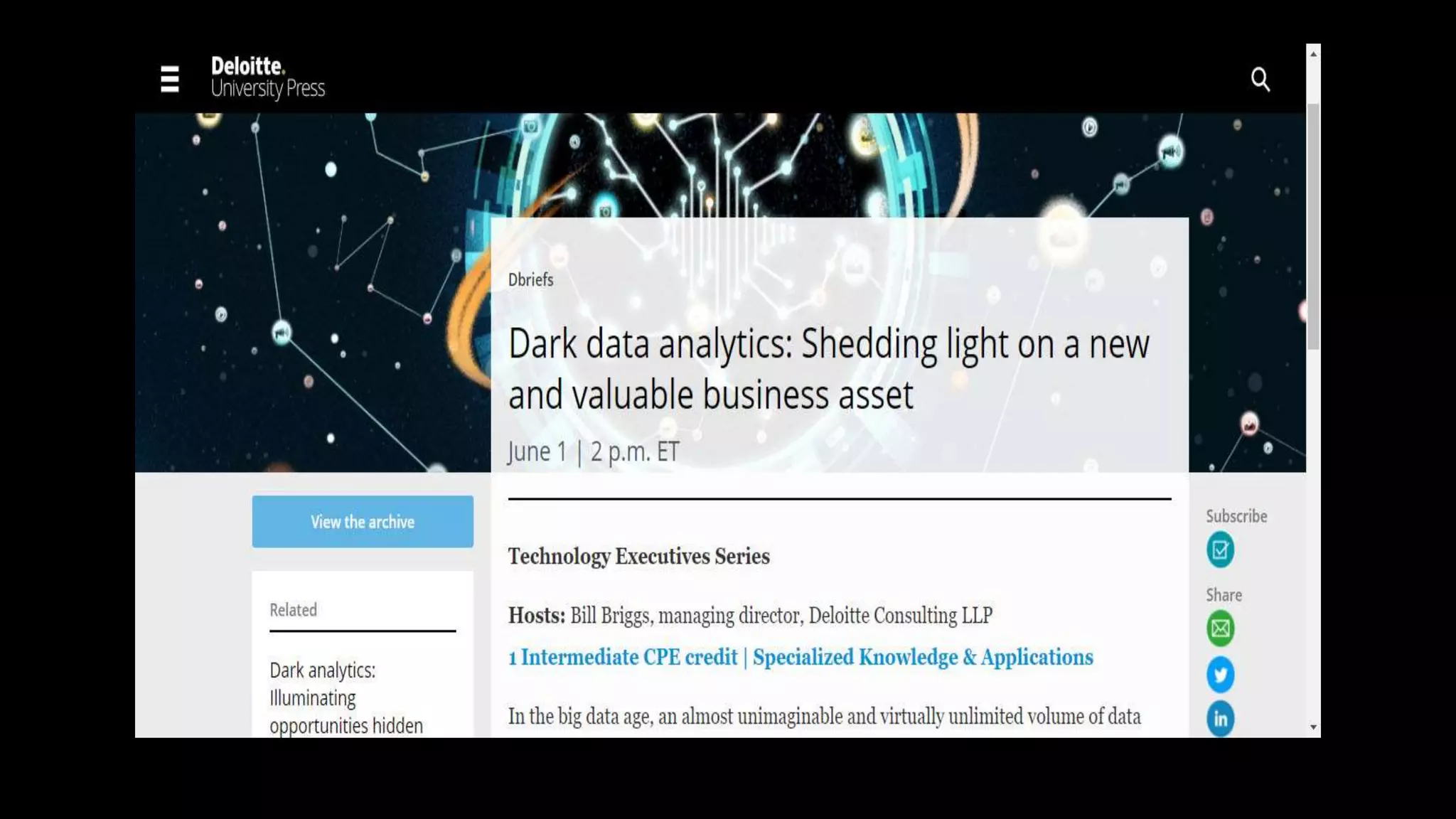 The document discusses dark data, defined as unutilized information collected by organizations that can pose legal, reputational, and financial risks if not analyzed properly. Approximately 90% of data generated is never used, leading to potential opportunities and insights being lost, particularly in sectors like healthcare and retail. Strategies for mitigating risks and turning dark data into valuable insights include ongoing inventory assessments, advanced analytical tools, and integrating data from various sources.