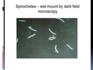 Dark field microscopy produces bright images of unstained samples against a dark background. It works by using a condenser with an opaque disk to block light entering the objective lens directly, allowing only light reflected off the sample to pass through. This causes specimens to appear bright on a dark background. It is useful for viewing transparent or unstained samples like bacteria, cells, and minerals due to the contrast it provides.