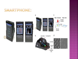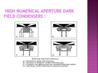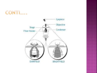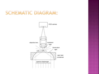 This document discusses dark field microscopy. It begins by defining dark field microscopy as a technique that produces bright objects against a dark background without using stains. This is achieved through a condenser that blocks light from entering the objective lens directly, allowing only light scattered from the specimen to pass through. Applications of dark field microscopy include viewing unstained samples like microorganisms, cells, and fibers. Advantages are its ability to examine transparent specimens, while disadvantages include sensitivity to dust or bubbles. Recent developments include using smartphone microscopy with LEDs for portable dark field imaging of nanoparticles.