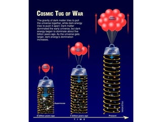 Dark matter is matter that does not emit or absorb light or radiation and can only be detected through its gravitational effects. It makes up 23% of the universe's energy. Its exact particle nature remains unknown. Dark matter was first hypothesized to account for discrepancies between the mass of large astronomical objects determined by their gravitational influence versus the mass calculated from the visible matter they contain. Understanding dark matter is important because it and dark energy make up over 90% of the universe's total energy.