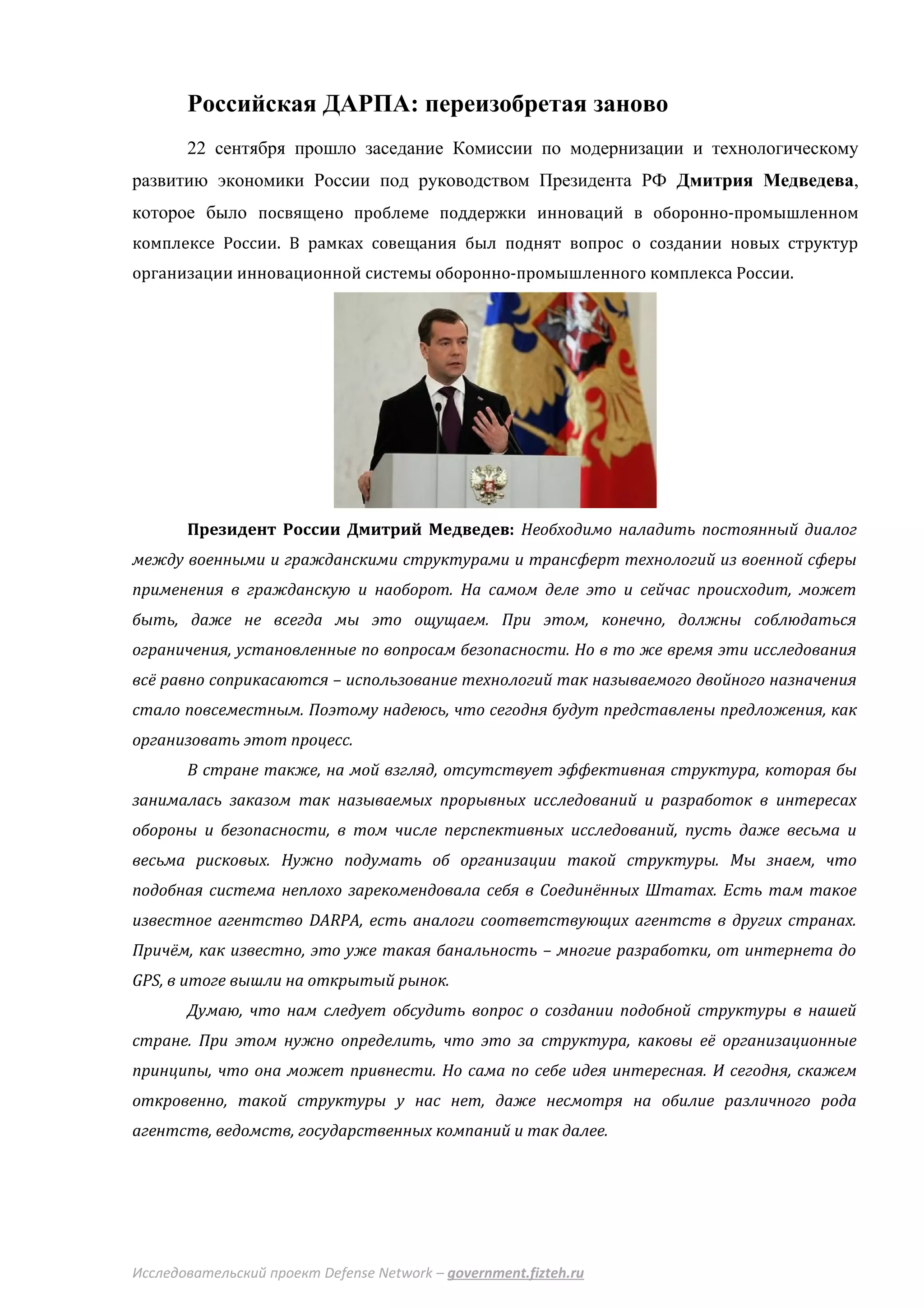 Заседание комиссии по модернизации экономики России под руководством Дмитрия Медведева сосредоточено на поддержке инноваций в оборонно-промышленном комплексе и создании новой структуры для организации прорывных исследований. Основное внимание уделяется наливу ресурсов на разработки двойного назначения и активизации сотрудничества между военными, гражданскими и небольшими инновационными компаниями. Вице-премьер Сергей Иванов отметил, что необходимо распределение бюджетных средств для финансирования исследований, чтобы повысить долю новой техники в вооруженных силах до 70-80%.