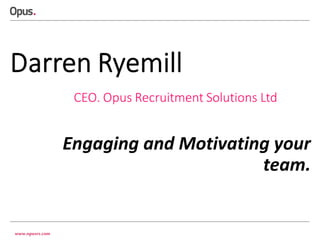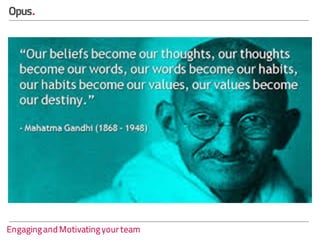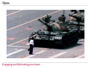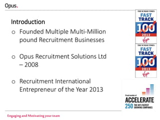 This document discusses ways to engage and motivate a team. It suggests that companies should recruit people who share the company's beliefs. It also emphasizes giving team members reasons to stay, such as career development opportunities and incentives. High-performing teams are motivated by setting clear performance targets and including the whole team in incentive programs.