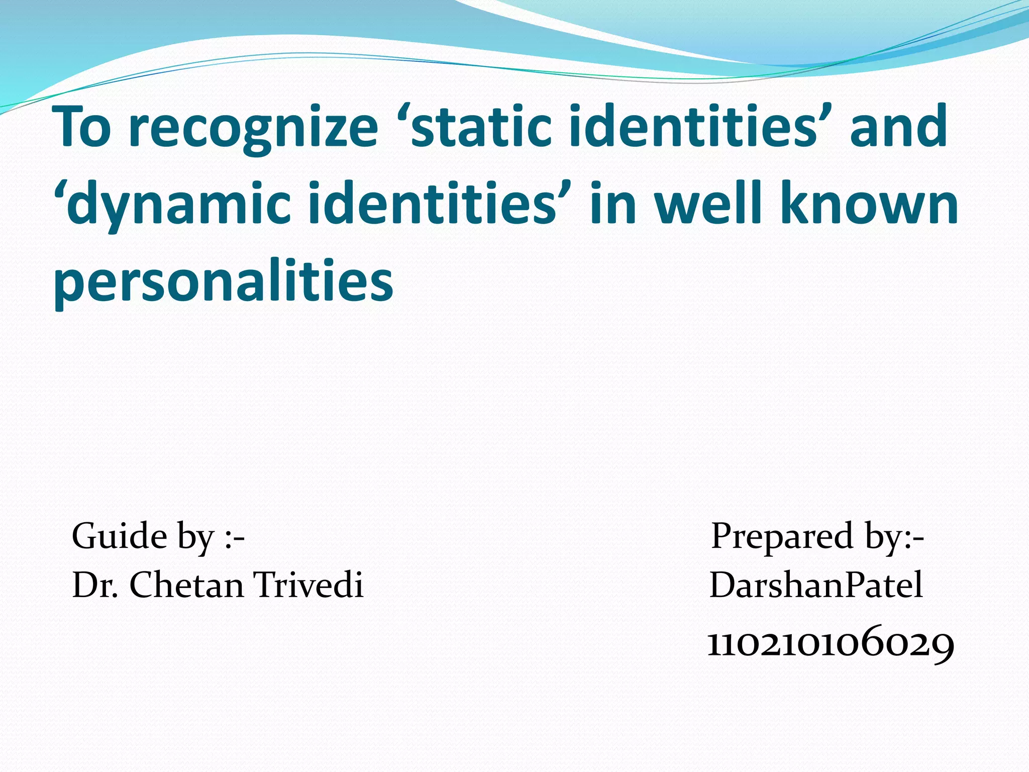 This document discusses static and dynamic identities, using examples of famous personalities. Static identities are defined by past achievements and qualifications, while dynamic identities are focused on future potential and ongoing growth. Sachin Tendulkar and Amitabh Bachchan are given as examples of dynamic identities, as they continue learning and contributing despite past success. Mayawati is presented as an example of static identities, as she focuses on past positions and luxury rather than responsible spending and future goals.