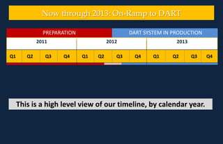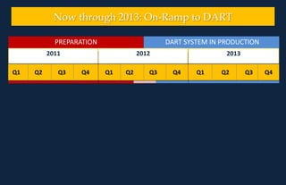 The document outlines a timeline for preparing for and transitioning to a new DART system between 2011 and 2013. It involves delivering new features, comprehensive testing, creating training materials, conducting user training for different units, and communicating updates. The go-live date for the new DART system is slated for Spring 2012, after which it will enter full production use.