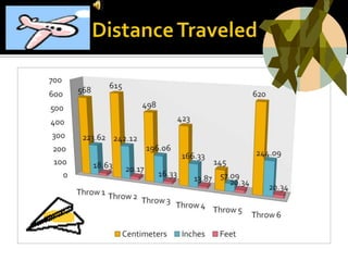 Emily conducted an experiment launching a paper airplane 6 times under different conditions to observe the effects on distance traveled and time aloft. She predicted the plane would fly over 1 meter each time. Her observations found that folding the elevators down caused the plane to fly downward, while adding a paperclip to the nose did not significantly affect flight distance or time, which she attributed mostly to how hard she threw the plane.