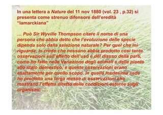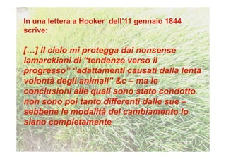 Il documento discute l'evoluzione della teoria evoluzionistica da Charles Darwin, sottolineando come le versioni accettate nel XIX secolo non riflettano le idee originali di Darwin. Esamina anche la controversia sui concetti di specie e l'impatto delle teorie evolutiva e sociale di Darwin su pensatori come Marx. Infine, si analizzano le implicazioni etiche delle teorie evolutive e la loro interpretazione in diverse sfere del pensiero.