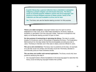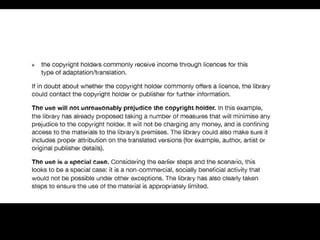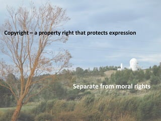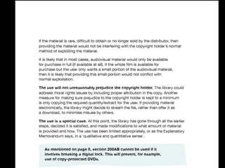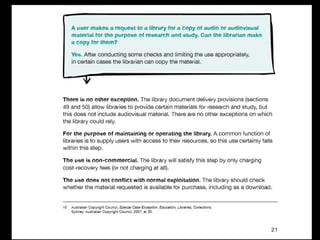 The document discusses copyright protection specifics as outlined by the Australian Libraries Copyright Committee during a 2015 training session. It covers ownership, exclusive rights, exceptions for educational purposes, and fair dealing regulations, and highlights the implications for libraries and educational institutions. Additionally, it emphasizes the importance of Creative Commons licenses and the responsible use of copyrighted materials in research and archiving.
