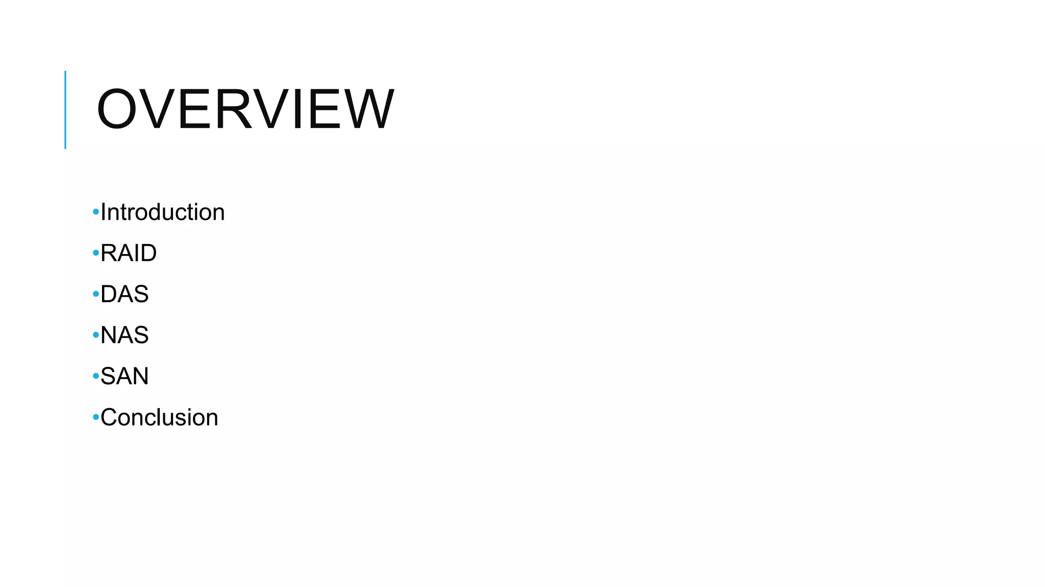 This document provides an overview of various data storage technologies including RAID, DAS, NAS, and SAN. It discusses RAID levels like RAID 0, 1, 5 which provide data striping and redundancy. Direct attached storage (DAS) connects directly to servers but cannot be shared, while network attached storage (NAS) uses file sharing protocols over IP networks. Storage area networks (SAN) use dedicated storage networks like Fibre Channel and iSCSI to provide block-level access to consolidated storage. The key is choosing the right solution based on capacity, performance, scalability, availability, data protection needs, and budget.