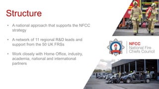 The document summarizes research and development efforts in the UK fire service. It describes the national structure which includes a national lead, regional leads across 11 regions, and support from 50 UK fire and rescue services. It works closely with various partners from government, industry, academia, and other emergency services. The approach covers fundamental, industrial, and capability development research. Key partners include various government defense and security organizations, universities, the fire industry association, and international partners through IFAFRI. It conducts surveys to identify emerging research needs and aims to map out fire and rescue related research. Future plans include more horizon scanning, capability analysis, and challenges to access science and technology assets.