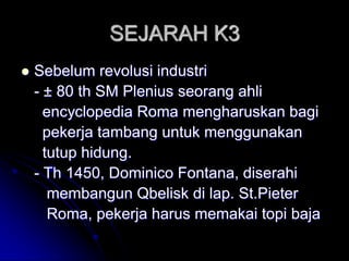 Dokumen ini menjelaskan sejarah dan perkembangan keselamatan dan kesehatan kerja (K3) dari era sebelum revolusi industri hingga era modern, termasuk tantangan yang dihadapi Indonesia dalam hal kecelakaan kerja. Indonesia mengalami banyak kecelakaan kerja tinggi, dengan perlunya tindakan dari pemerintah untuk meningkatkan perlindungan keselamatan. Keselamatan kerja dipengaruhi oleh daya saing global dan budaya kesejahteraan masyarakat, serta memerlukan pendekatan terintegrasi untuk menghadapi risiko dan bahaya.