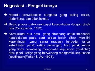 Dokumen ini membahas tentang negosiasi sebagai metode penyelesaian sengketa yang melibatkan komunikasi dua arah untuk mencapai kesepakatan tanpa pihak ketiga. Keuntungan negosiasi termasuk menciptakan pemahaman dan memungkinkan solusi bersama, sedangkan kekurangan meliputi kebutuhan akan itikad baik dan keseimbangan kekuatan antara pihak-pihak yang terlibat. Tahapan negosiasi meliputi persiapan, orientasi, argumentasi, dan penutupan, serta diwarnai oleh berbagai kendala yang memerlukan cara pengatasan yang tepat.