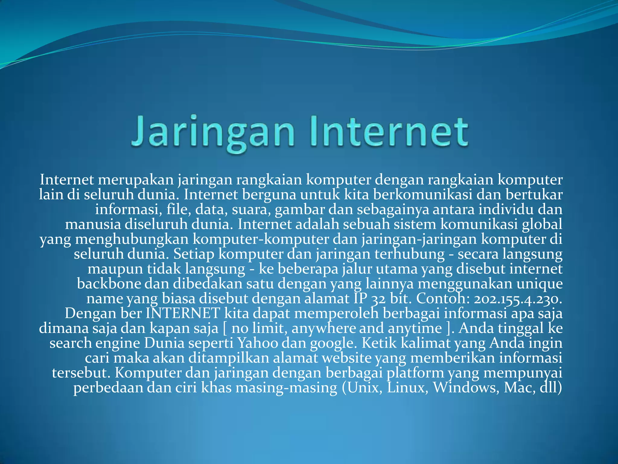 Internet adalah jaringan global yang menghubungkan komputer dan jaringan di seluruh dunia, memungkinkan pertukaran informasi, file, dan data. Intranet menggunakan teknologi serupa untuk jaringan internal perusahaan."