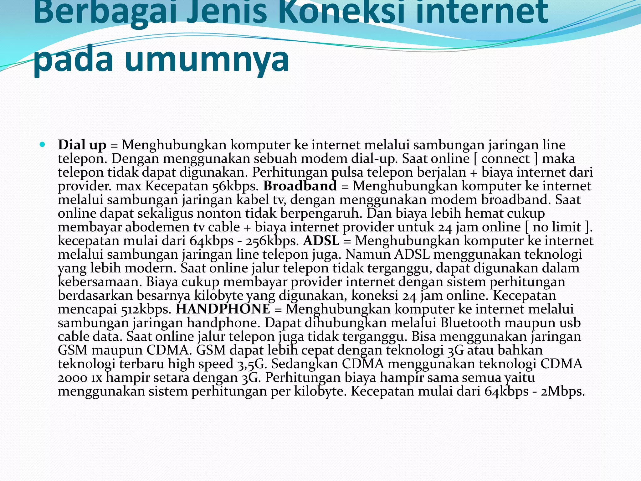 provider. max Kecepatan 56kbps. Broadband = Menghubungkan komputer ke internet