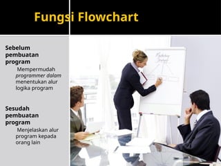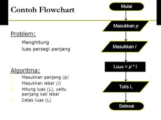 Flowchart adalah diagram alir yang menggambarkan alur kerja program menggunakan simbol khusus, bertujuan untuk memudahkan programmer memahami dan menjelaskan logika program. Pedoman pembuatan flowchart mencakup penempatan dari atas ke bawah, menunjukkan kegiatan mulai dan selesai, serta menggunakan simbol standar untuk menggambarkan proses. Algoritma dibangun dari tiga konstruksi dasar: struktur runtunan, pemilihan, dan pengulangan.