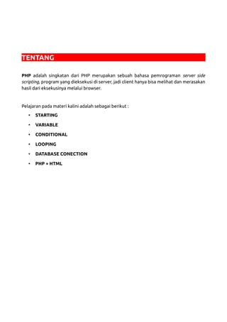 Dokumen tersebut memberikan penjelasan tentang dasar-dasar PHP mulai dari apa itu PHP, persyaratan untuk membuatnya, cara memulai belajar PHP, penggunaan variabel, conditional, looping, koneksi database, hingga CRUD data.