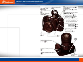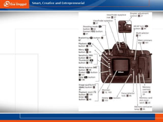 Dokumen ini menjelaskan bagian-bagian dan fungsi kamera SLR dan DSLR, termasuk cara mengatur bukaan diafragma dan kecepatan rana untuk mendapatkan pencahayaan yang optimal. Penjelasan tentang komposisi gambar dan teknik pemotretan juga disertakan, seperti teknik freezing dan blurring. Selain itu, fitur dan pengaturan pada kamera DSLR seperti mode pengambilan gambar dan tombol-fungsi juga dibahas.