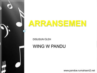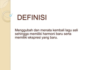 Dokumen tersebut membahas tentang pengertian dan teknik-teknik arrangemen musik, termasuk cara mengatur ulang melodi, harmoni, dan ekspresi musikal dari lagu asli, menambahkan bagian pembuka, tengah, dan penutup, serta mempertimbangkan unsur-unsur seperti instrumen dominan dan variasi emosi.