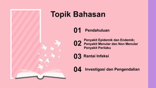Dokumen tersebut membahas tentang epidemiologi penyakit menular dan non menular. Menguraikan konsep penyakit epidemik, endemik, penyakit menular dan non menular, rantai infeksi, investigasi dan pengendalian penyakit, serta pemberantasan penyakit.