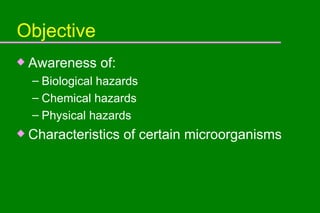 This document discusses biological, chemical, and physical hazards in food. It defines hazards as agents that can cause illness or injury. Biological hazards include microorganisms like bacteria, viruses, parasites, and protozoa. Chemical hazards can be naturally occurring, intentionally added like food additives, or unintentionally added. Physical hazards refer to extraneous matter found in food like glass, wood, or metal that should not be there. The document provides examples of specific pathogens and toxins that pose hazards in different categories.