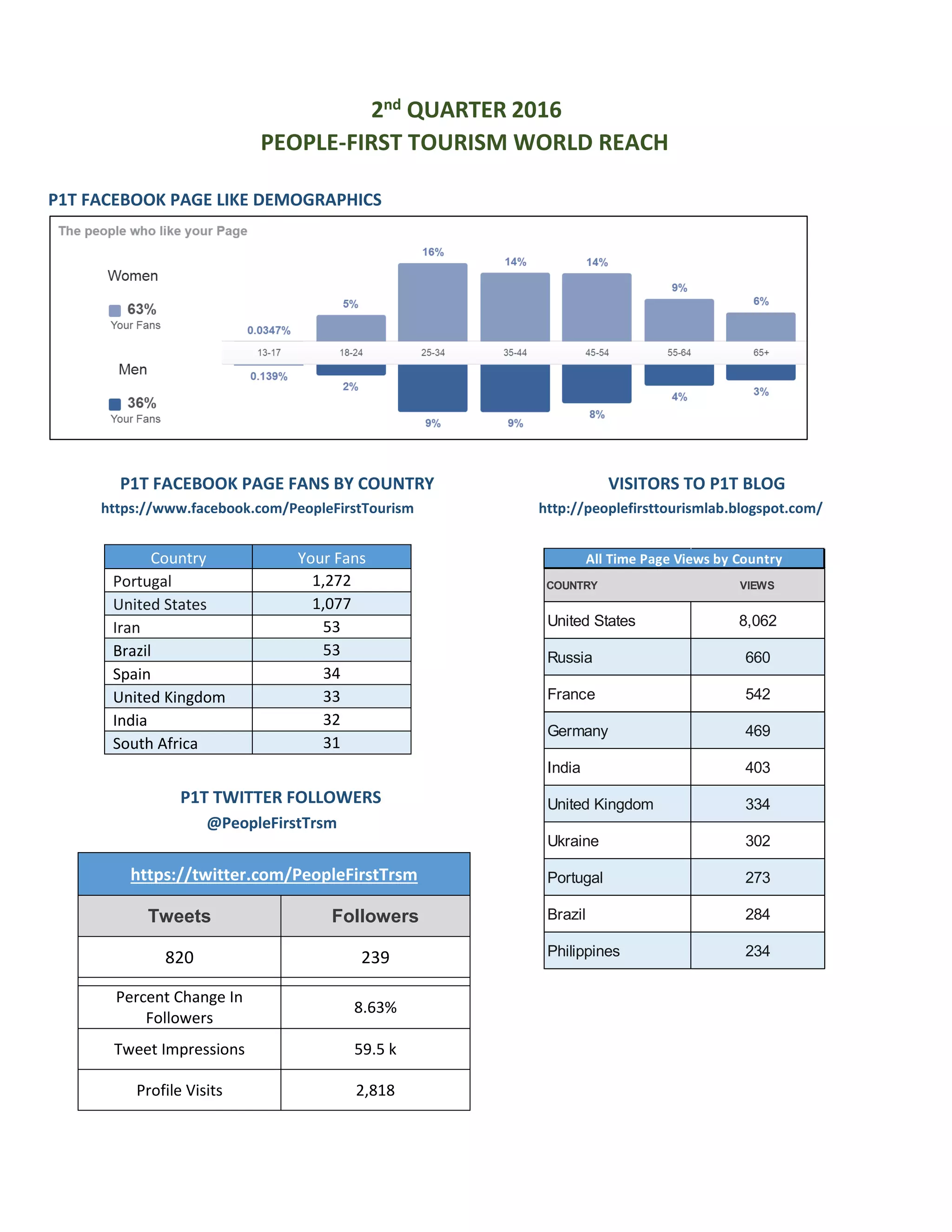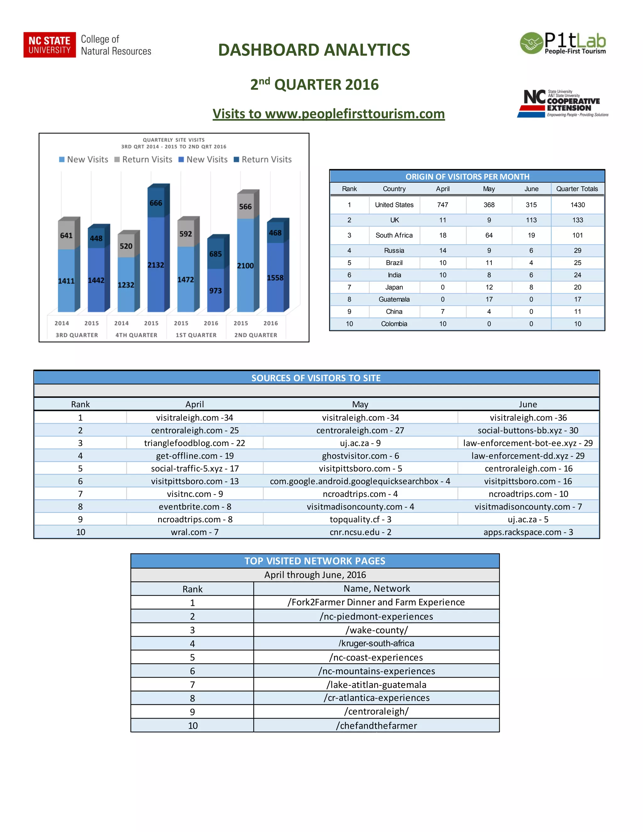 The United States had the most visits to the website with 1430 in the second quarter of 2016. The top sources of visitors were various local sites like visitraleigh.com and centroraleigh.com. The top visited network pages were related to experiences in North Carolina regions like the Piedmont and mountains. The Facebook page had the most fans from Portugal and the United States, while the Twitter followers grew nearly 9% with the most views coming from the United States.