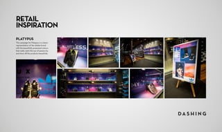 This document provides examples of retail displays and campaigns produced by Dashing for various brands. It includes summaries of campaigns for Platypus, Vans, Mecca, General Pants Co., North Face, Athlete's Foot, UGG Store, Uniqlo, Vans, Seafolly, Hermes, Samsung, David Jones, General Pants Co., Athlete's Foot, Rebel Sport, Under Armour, Uniqlo, Hermes, Timberland, Rivers, Adidas, Seafolly, Campbells, Mad Mex, Seafolly, Athlete's Foot, Lego, Seafolly, Rebel, and Under Armour that showcase the use of various print materials like decals, banners