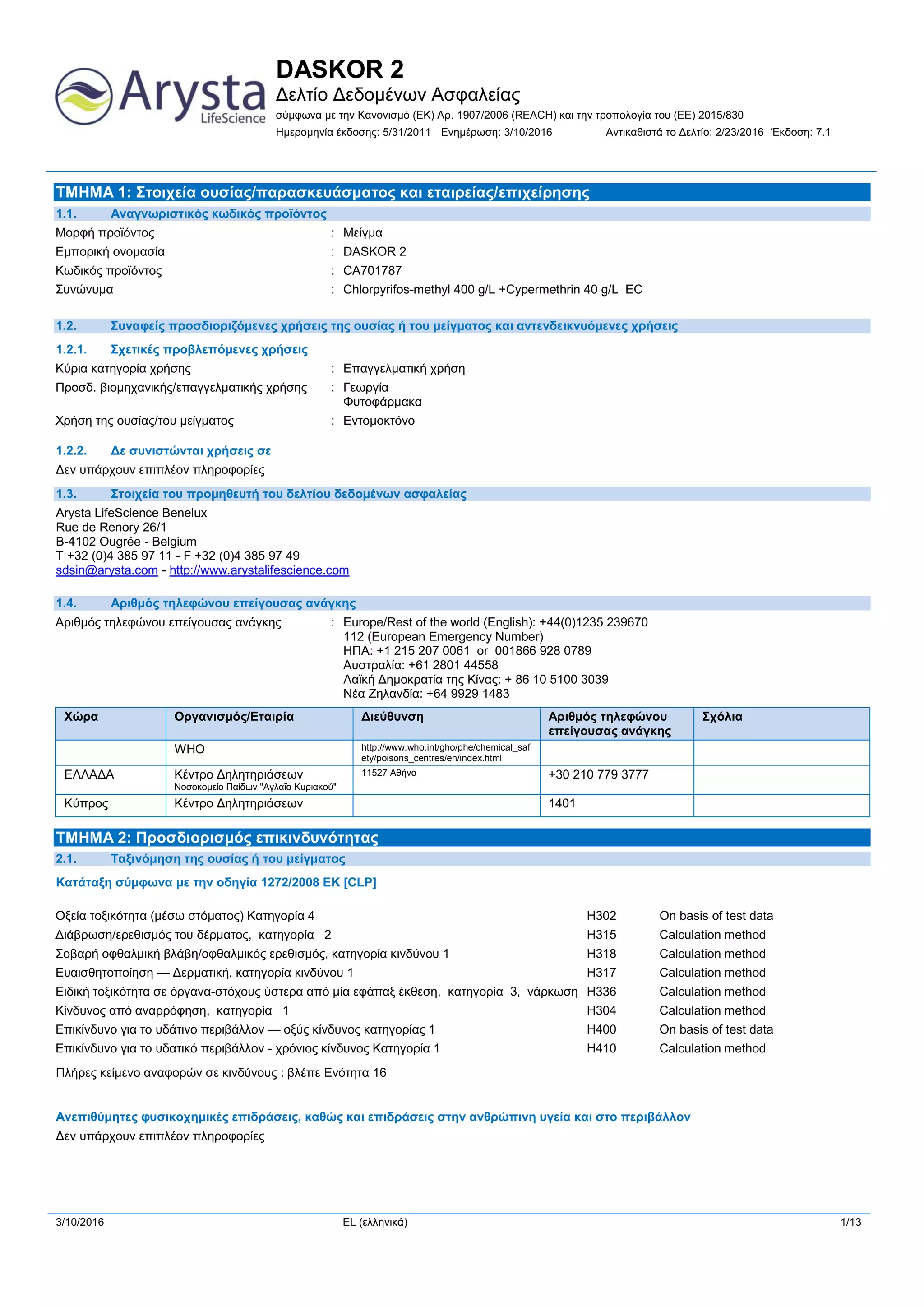 Κατάταξη σύμφωνα με την οδηγία 1272/2008 ΕΚ [CLP]Μείγμα/Ουσία: ΔΔΑ ΕΕ 2015: Σύμφωνα με τον κανονισμό (ΕΕ) 2015/830